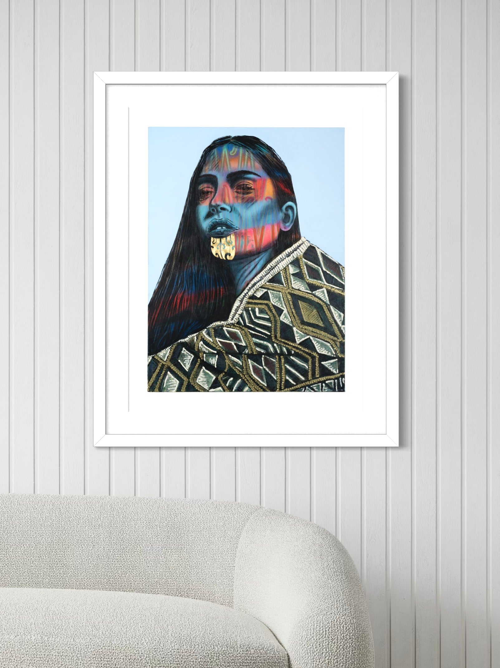 Whakapuāwai holds both power and grace. A pūhoro pattern moves across the figure’s face like light through water, alive with rhythm and permanence. The kauae, gilded in gold, is both declaration and anchor — dignified, enduring, and radiant in its strength. Her korowai, sculptural and richly textured, feels monumental: at once protective and celebratory, a mantle of whakapapa rendered with contemporary force.