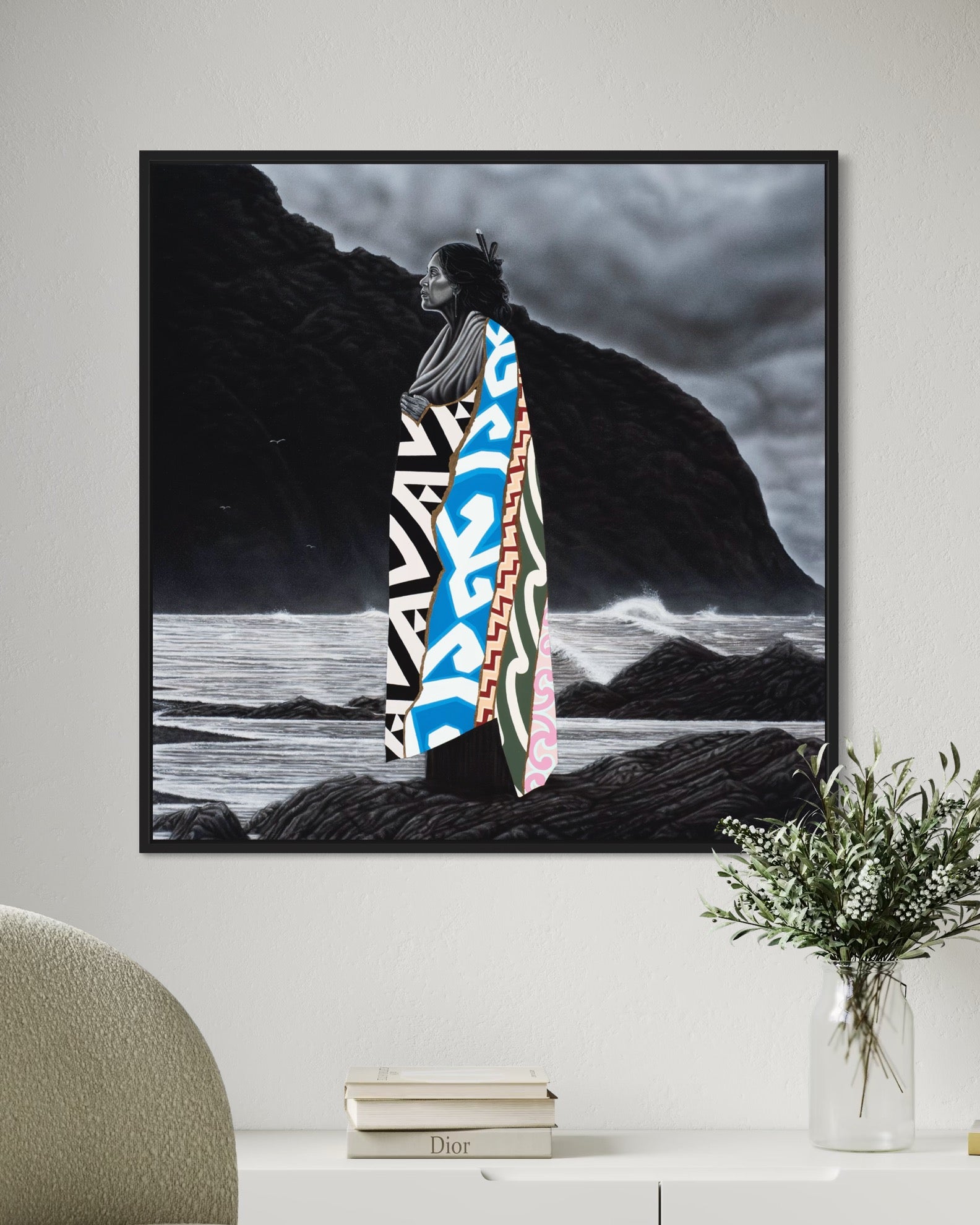 She stands grounded on coastal rock, the land and sea alive with memory. Though the sky above is stormed and shifting, her presence remains luminous, a declaration of survival, identity, and reconnection.